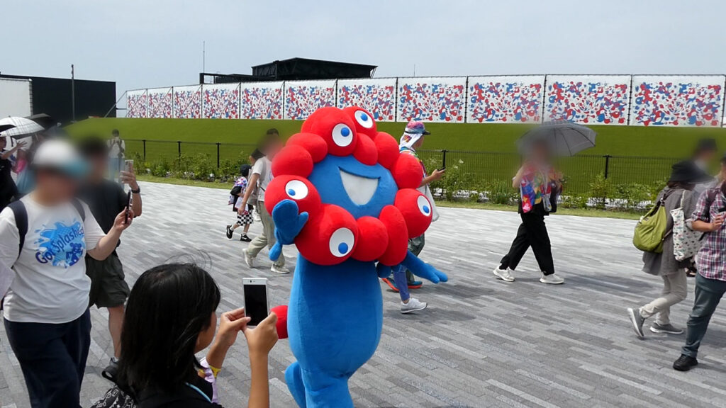 次の予約まで1時間弱の時間があるので西エリアを散策。絶妙なタイミングで、ミャクミャクのお散歩に出会えました。